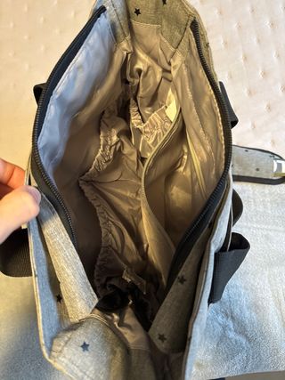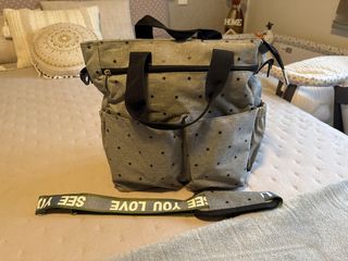 Bolso para carro de bebé con un diseño moderno y práctico. - Color gris con estampado de estrellas negras. - Incluye correa ajustable. - Múltiples bolsillos exteriores.
