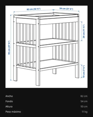 Mueble cambiador para bebé en color blanco. De IKEA. Dispone de varios estantes para organizar los artículos del bebé. - Estructura de madera blanca. - Dos estantes inferiores. - Incluye colchón cambiador, ganchos y cubetas.