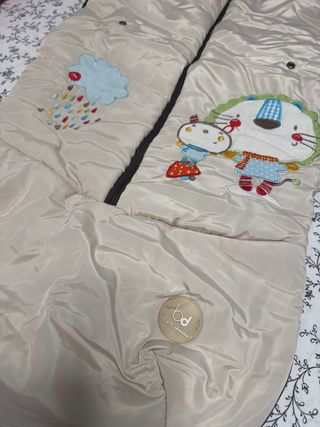 Saco de silla o carro para bebé, ideal para mantener a tu pequeño abrigado. - Diseño exterior en color beige. - Interior forrado en tejido naranja. - Adornos de un león, una nube con gotas de lluvia y un pequeño personaje. - Cierre central con cremallera.