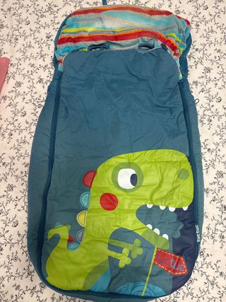 Saco para silla de paseo con un divertido diseño de dinosaurio. - Estampado de dinosaurio verde. - Interior con rayas de colores. - Marca: Tuc Tuc.