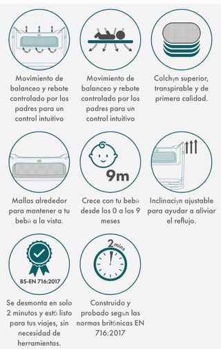 Minicuna de la marca Chicco, ideal para los primeros meses del bebé. Su diseño permite tener al bebé cerca. - Color verde azulado. - Estructura de metal ligera. - Laterales de tela con ventana de malla.