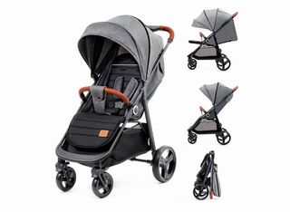 Silla de paseo Kinderkraft Grande Plus en color gris y negro. - Diseño moderno y funcional. - Capota amplia para proteger del sol. - Asiento acolchado y arnés de seguridad. - Ruedas delanteras giratorias y traseras con freno. - Empuñaduras de cuero sintético.