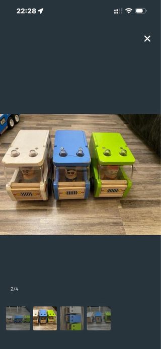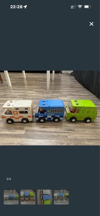 Set de tres vehículos de juguete de madera. - Ambulancia blanca con detalles naranjas y cruz roja. - Furgoneta azul de policía con POLICE escrito. - Vehículo verde con detalles naranjas.