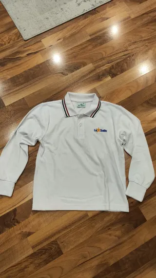 Polo blanco de manga larga para uniforme escolar. - Cuello con detalles de rayas. - Logo de La Salle bordado en el pecho. - Talla 10. En perfecto estado, prácticamente pasa por nuevo.
