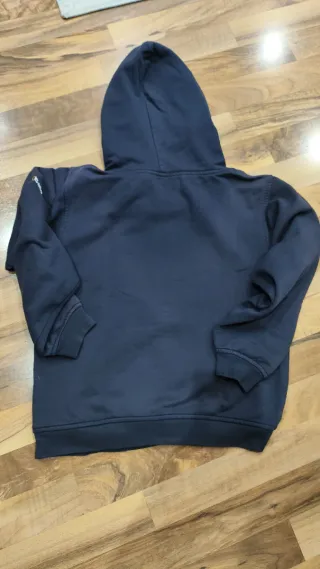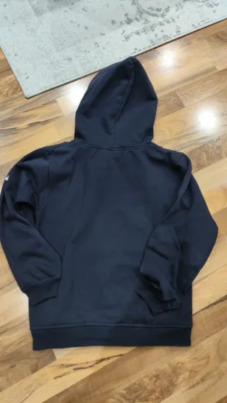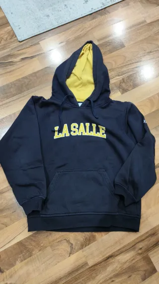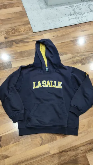 Sudadera azul marino con capucha y bolsillo frontal, talla 10. - Logo LA SALLE en amarillo y blanco en el pecho. - Interior de la capucha en color amarillo. - Detalle de estrella en la manga derecha. En buen estado.