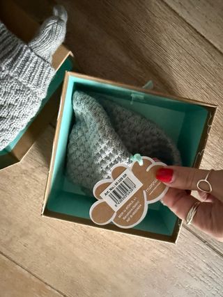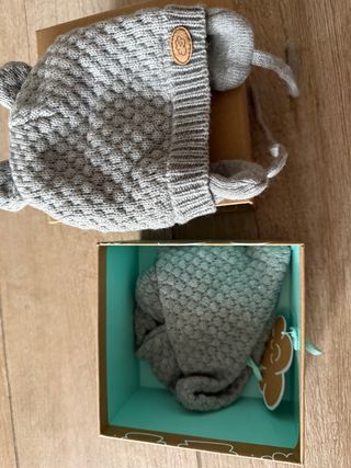 Conjunto de punto gris para bebé, ideal para mantenerlos abrigados. - Gorro con orejitas y cordones. - Manoplas a juego. - Cuello a juego.