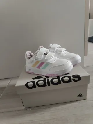 Zapatillas deportivas para niña de la marca Adidas número 25 - Color blanco con detalles de rayas en tonos pastel. - Cierre de velcro para un ajuste fácil. - Diseño cómodo y ligero.