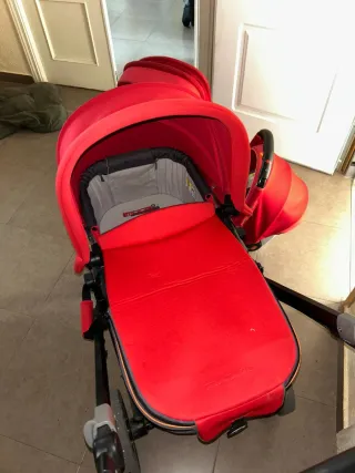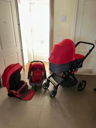 Conjunto de paseo para bebé en color rojo. Incluye silla de coche, capazo y silla de paseo. - Silla de coche con capota. - Capazo con asa. - Silla de paseo con capota y cesta.