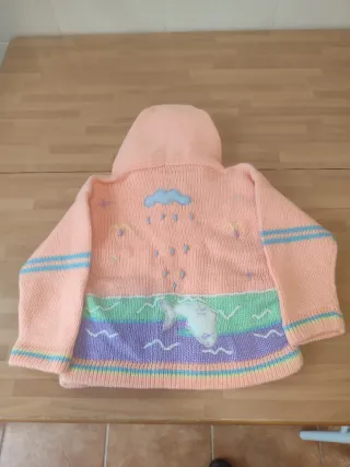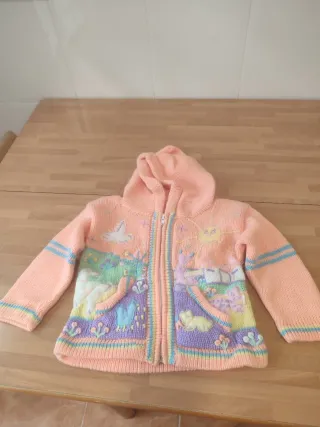 Adorable chaqueta tejida a mano para bebé, con un diseño lleno de detalles y colores alegres. No tiene la etiqueta pero está sin estrenar - Color principal melocotón. - Capucha integrada. - Cremallera frontal. - Motivos de animales y naturaleza bordados. - Puños y bajo elásticos.