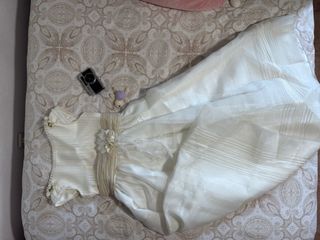Vestido de comunión de El Corte Inglés con fajín. - Fajín en color verde. - Adornos florales en hombros y fajín. - Tejido con finas rayas verticales en el cuerpo. - Falda con varias capas de tul y detalles de rayas horizontales.