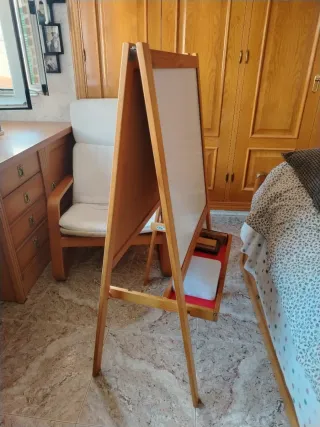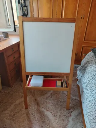 Pizarra infantil de doble cara para que los más pequeños den rienda suelta a su creatividad. - Pizarra blanca Para rotuladores y pizarra negra para tizas. - Estructura de madera. - Bandeja para accesorios.