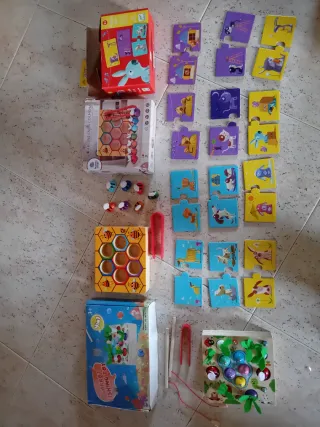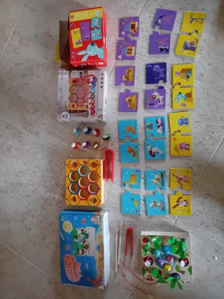 Conjunto de varios juegos infantiles para el desarrollo de habilidades. - Juego de puzles con animales y figuras - Juego de encajar abejas de colores en la colmena. - Juego de pesca de con imanes y pinzas Educativos, completos, de madera, montesorri, las cajas se ven usadas y con desgaste Variedad colores niño niña bebé regalo cumpleaños Navidad original educa educativo