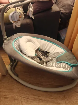 Hamaca para bebé con un diseño moderno y acolchado. - Incluye un móvil con peluches. - Asiento con cojín para la cabeza. - Arnés de seguridad de tres puntos. - Tejido gris con estampado de hojas y ribete turquesa. Sin apenas uso. Dispone de vibración y melodías con varios niveles de volumen. Precio original 59,95€