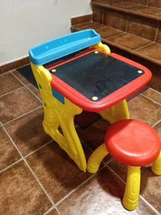 Pupitre infantil de la marca Crayola, ideal para que los más pequeños desarrollen su creatividad. Incluye banqueta. - Estructura de plástico resistente en color amarillo. - Superficie de escritura negra. - Bandeja superior azul para materiales. - Asiento de banqueta en color rojo.