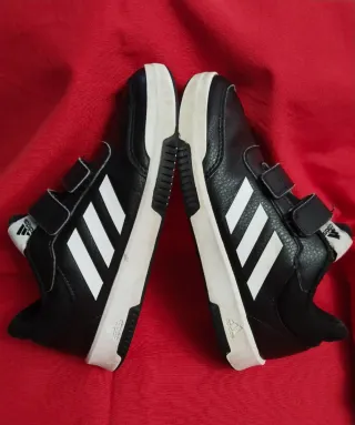 Zapatillas deportivas Adidas en color negro y blanco, talla 34. - Cierre de velcro. - Tres franjas blancas características de la marca.