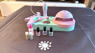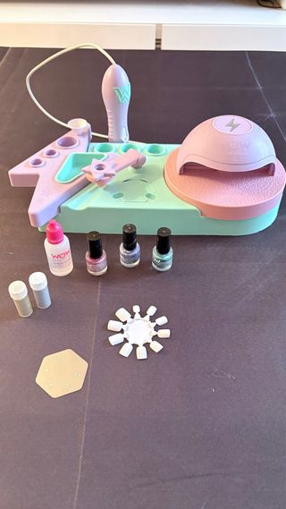Set para decorar y esmaltar uñas, ideal para niños. Incluye varios esmaltes y accesorios para crear diseños divertidos. - Base de juego con soporte para uñas. - Lámpara LED para secado rápido. - Esmaltes de colores variados. - Adornos y purpurina para decorar.
