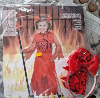 Disfraz de diablesa para niña, ideal para fiestas de disfraces o Halloween. Incluye accesorios. - Talla: 7-9 años. - Color: Rojo. - Incluye: Diadema con cuernos y vestido. - Diseño con detalles de llamas y adornos negros.