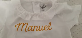 Body de bebé blanco con el nombre Manuel serigrafiado amarillo mostaza. Tiene un bonito cuello con volante. - Cierre de botones a presión en la parte inferior y trasera - Manga corta.