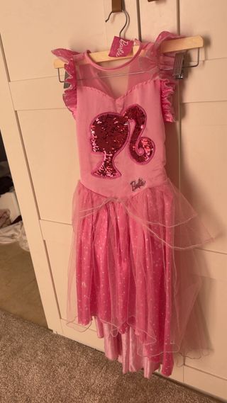 Vestido rosa de la marca Barbie, ideal para niñas. Presenta un diseño con lentejuelas brillantes. - Silueta de Barbie con lentejuelas. - Mangas con volantes. - Falda de tul. - Logo de Barbie en la parte delantera.