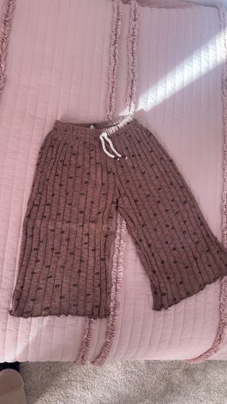 Pantalones culotte acanalados de color marrón con un discreto estampado de pequeños motivos. - Cintura elástica con cordón. - Diseño acanalado. - Bajo con acabado festoneado.