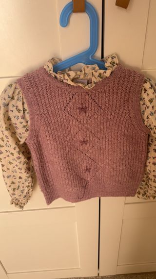 Conjunto floral y chaleco tejido niña