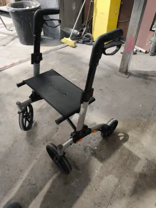 Andador con asiento integrado y sistema de frenos, diseñado para facilitar la movilidad. - Estructura plegable para un fácil almacenamiento y transporte. - Asiento cómodo para descansar. - Ruedas para un desplazamiento suave. Le falta el respaldo que se puede comprar suelto, de hay el precio que tiene