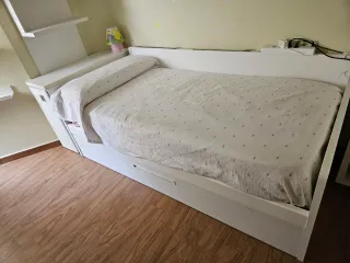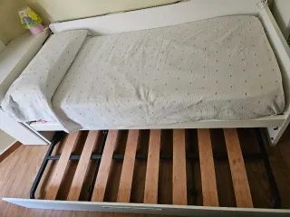 Se vende cama nido blanca con estantería a juego. Ideal para optimizar el espacio. - Cama nido con cama inferior. - Estantería superior y cajonera. - Colchón incluido.