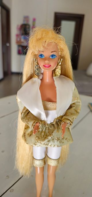Preciosa muñeca Barbie Hollywood Hair. Esta Barbie luce un conjunto dorado y tiene una larga melena rubia dorada, algun desgaste en la falda foto n°4, solo le faltarían las botas y la cinta del pelo por lo demás genial - Incluye una muñeca Barbie con un vestido dorado. - Cabello largo y rubio. - Accesorios dorados.