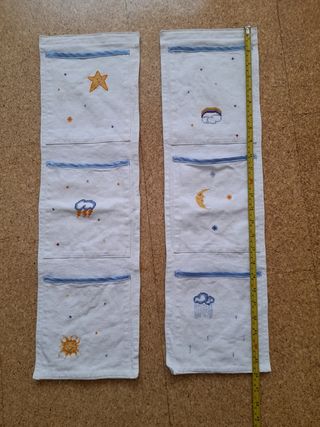 6 bolsillos de 18 ×16, para hab. infantil. los teniamos por la parte de dentro en las puertas del armario para cositas pequeñas, muy practico, bordados en punto de cruz. Con velcro por la parte de atras.