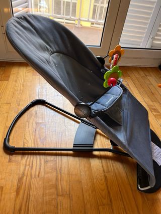 Hamaca BabyBjorn en color gris con un divertido juguete. - Hamaca con diseño ergonómico. - Incluye barra de juegos con diferentes texturas y colores. - Tejido Woven/jersey, suave y confortable. Perfecta, ligera y práctica. Una maravilla que te salvará la vida, para un momento de relax, una siestecilla o un momento divertido. El tejido está un poco decolorado, pero sigue siendo perfectamente funcional y en buen estado general. Estructura fiable y segura. Se pliega para guardar. Tres posiciones de reclinado, y en cuanto el bebé crece, se gira la tela y se convierte en una butaca. De 0 a 2 años. Cumple la norma OEKO-TEX 100 Clase 1