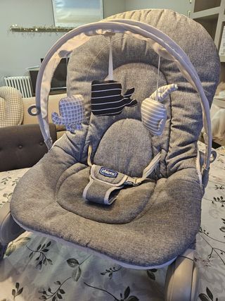Hamaca balancín de la marca Chicco, ideal para bebés. Es cómoda y segura. - Color gris jaspeado. - Incluye arco de juegos con peluches. - Asiento acolchado. - Las dos por 70€ - Individual 40€ c/u