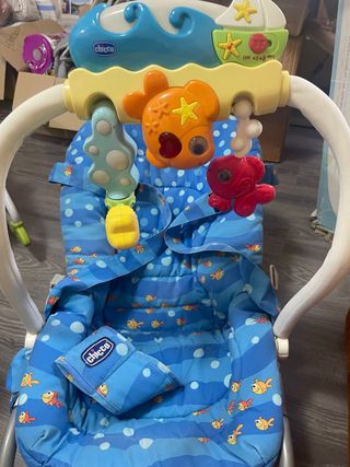 Preciosa hamaca balancín de Chicco, en perfecto estado. Varias posiciones: tumbado, recostado y sentado. Las patas se pueden poner fija para que no se balancee. - Con asas para transportar. - No tiene ni desgaste ni manchas. - Con reductor para bebés para los más pequeños. - Tejido suave y acolchado. - Arco de juegos con juguetes colgantes. - El Arco es de quita y pon.