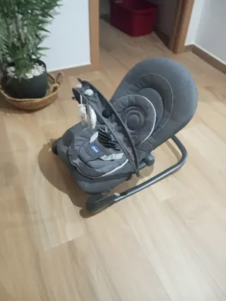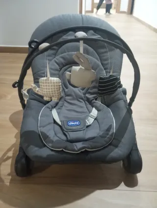 Balancín para bebés de la marca Chicco en color gris. Es un asiento cómodo y seguro para los más pequeños de 0 a 18 kg usado un par de veces. - Diseño acolchado. - Incluye juguete colgante. - Ruedas para facilitar el movimiento.