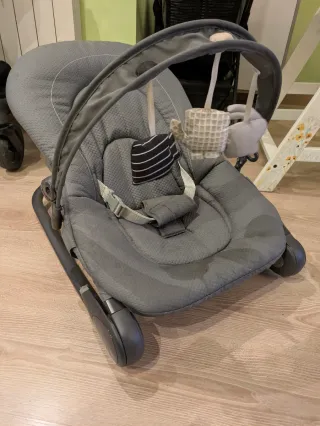 Hamaca Chicco Hoopla en color gris oscuro. Es una hamaca súper completa, cómoda y versátil que acompaña el crecimiento de tu bebé desde el primer día (embalada en su caja). Características principales: • Estado: En muy buen estado y lista para usar. • Evolutiva: Incluye el cojín reductor modular (en dos piezas) para que los recién nacidos estén bien recogidos y cómodos. • Arco de juegos: Incluye la barra con juguetes colgantes originales (un pajarito, un espejito y un elefante) diseñados para estimular el desarrollo táctil y visual. • Respaldo reclinable: Se puede ajustar en 4 posiciones diferentes para pasar del descanso al juego
