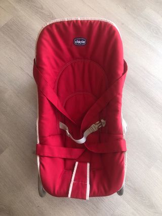 Hamaca para bebés de la marca Chicco en color rojo. Es cómoda y segura para los más pequeños. La hamaca está bastante desgastada por la parte de abajo, de ahí su precio, pero la zona que está en contacto con el bebé está en perfecto estado. Tiene varias posiciones de reclinado, ideal para que el bebé descanse o esté más incorporado, y es adecuada desde el nacimiento hasta unos 9 kg (aprox. 6–9 meses).