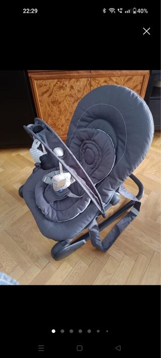 Hamaca para bebé de la marca Chicco en color gris. Puede ponerse modo balancín o fijo. - Acolchado suave. - Arnés de seguridad. - Barra de juegos con peluches. Se quita y se pone.