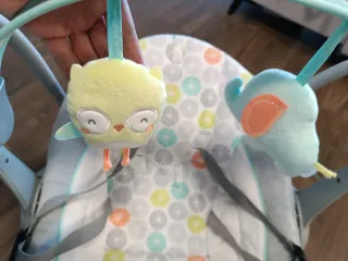 Columpio mecedora de la marca Fisher Price con un diseño infantil. - Asiento acolchado con estampado de animales marinos. - Barra de juguetes con peluches. - Estructura de soporte resistente. - Le faltan los arnes