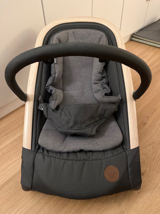 Hamaca para bebé de la marca Maxi-Cosi. Diseño moderno y confortable. - Estructura de madera. - Cojín acolchado gris. - Arnés de seguridad.