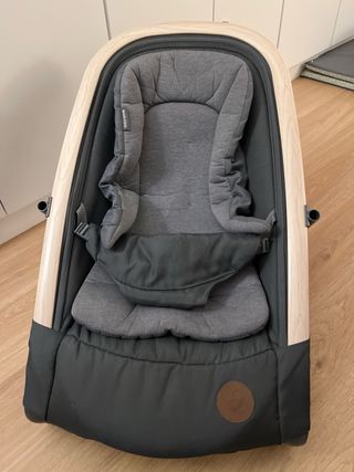 Hamaca para bebé de la marca Maxicosi con un diseño moderno y confortable. - Estructura de madera clara. - Asiento acolchado en gris. - Barra de seguridad negra. - Incluye reductor para recién nacidos. Entrega en mano (venir q buscar)