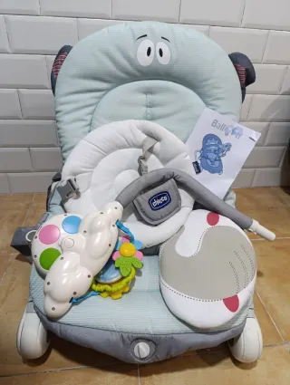 Hamaca para bebés de la marca Chicco. Con un diseño acolchado y estampado de estrellas y rayas de colores. - Tejido suave y confortable. - Cinturones de seguridad. - Base con patas para mayor estabilidad. Tiene una especie de juguete suave para que el bebe se distraiga. Si te lo llevss en pack con el andador 50 euros todo.