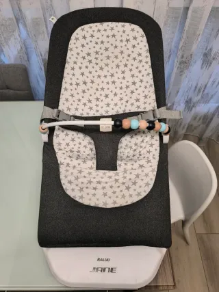 Hamaca para bebé de la marca Jané, modelo Baluu. Con un diseño moderno y cómodo. - Tejido gris con estampado de estrellas blancas. - Barra de juegos con cuentas de madera y silicona. - Desde el nacimiento hasta los 9 kilos. Con muy poco uso.