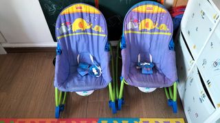 2 Hamacas Fisher-Price con diseño de elefantes y paraguas. El precio es por unidad. Si quieres las dos 20€ total. - Color principal morado con detalles en amarillo y azul. - Estructura de soporte en color verde y azul. - Arnés de seguridad de tres puntos.