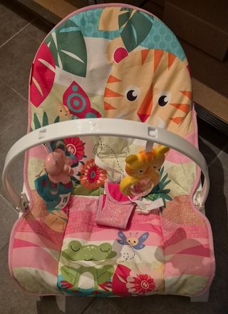 Preciosa hamaca mecedora Fisher-Price en color rosa y detalles florales. Se transforma fácilmente en silla para cuando el bebé crece. - Ideal para bebés y niños pequeños. - Diseño rosa con estampado floral con una mariposa musical. - también inclúe un punto para activar una vibración para relajar al bebé. - Incluye arco de juegos con juguetes colgantes. - Fácil conversión a mecedora. Se puede utilizar hasta los 18 kg de peso máximo. El acolchado puede lavarse en la lavadora y secarse en la secadora. Se ha utilizado en muyco pocas ocasiones ya que se compro para una segunda residencia.