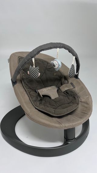 Hamaquita Nuna en color marrón, con un diseño moderno y elegante. - Incluye arco de juegos con peluches. - Acolchado interior suave. - Base giratoria. (Se balancea hacia los lados de forma muy sutil y agradable) -tela desgastada por las lavadas -pequeño arañazo en la tela