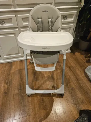 Trona reclinable y ajustable en altura Sirve como hamaca los primeros meses pero en altura y no tener que agacharte al suelo. La mesa es extraíble, y tiene una bandeja encima que se pone y quita para mejor limpieza. Luego se puede poner directamente a tu mesa sin la bandeja. Polipiel color gris de muy fácil limpieza con paño húmedo. Se desmonta y se puede lavar en lavadora también Muy buen estado Tiene ruedas Se puede plegar Marca pre-prego, de venta en Amazon por 170€