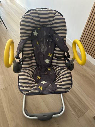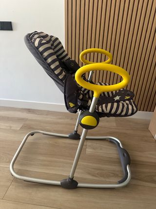 Hamaca mecedora para bebé de la marca Beaba, modelo Up&Down. Está en buen estado y es perfecta para que el bebé se relaje y se divierta. - Diseño moderno con rayas grises y detalles amarillos. - Incluye arnés de seguridad, reductor, capota y barra de juguetes (no se ve en las fotos pero los tengo) - Mecedora con estructura metálica. Hay un pequeño descosido en la tela, se puede ver en una de las fotos, pero no afecta el uso ni la seguridad de la hamaca. Está por la parte de atras, se tendría que coser de nuevo. Más cosas de bebé en mi perfil. Casa sin fumador ni mascota.