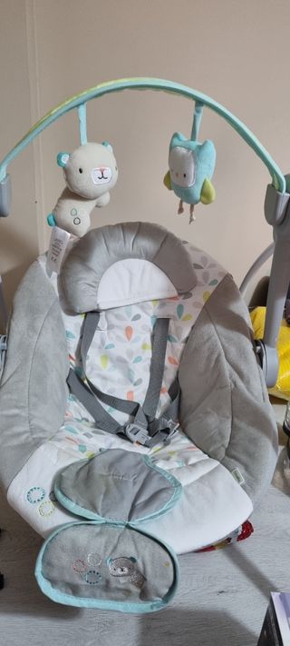 Hamaca balancín Felicity Floral Ingenuity con un arco de juegos del que cuelgan muñequitos. Reclinado en tres posiciones. Melodías con control de volumen. Vibraciones relajantes. Se desmonta totalmente de forma sencilla. Está en muy buen estado, tiene muy poco uso. Badajoz