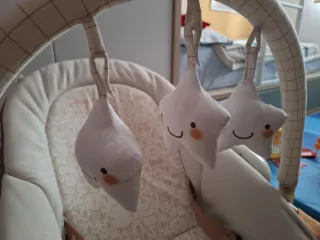 Hamaquita Jané evolution, está como nuevo. Mi hijo no la quiso, conservo su caja. Tiene música y vibración. En las imagenes están las especificaciones. Es gris con estrellitas blancas. Tengo el parque a juego. Me costó 150 euros. Preferible entrega en mano en zona de Badajoz, Cáceres,Villafranca.