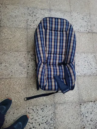 Hamaca acolchada para bebé con un diseño a cuadros en tonos azules, blancos y anaranjados. Es cómoda y suave. - Tejido a cuadros. - Acolchado interior. - Incluye cinturón de seguridad.