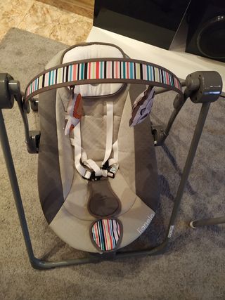 Hamaca para bebe. Tiene vibración, sonidos y el movimiento balancín puede ser manual o automático( lo hace solo) color gris y blanco. Está en muy buen estado